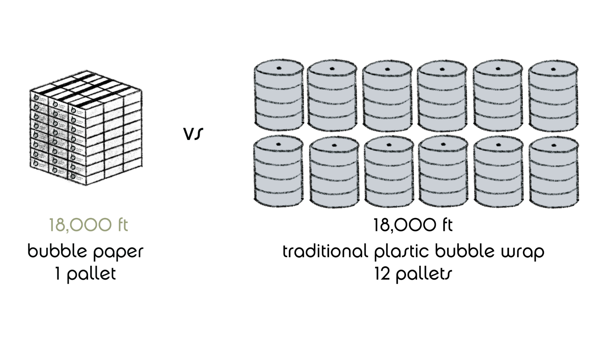 One pallet of Bubble Paper Wrap holds 18,000 feet of product — the same amount of traditional bubble wrap would take up 12 pallets. That means less storage space, fewer trucks, and lower freight emissions.